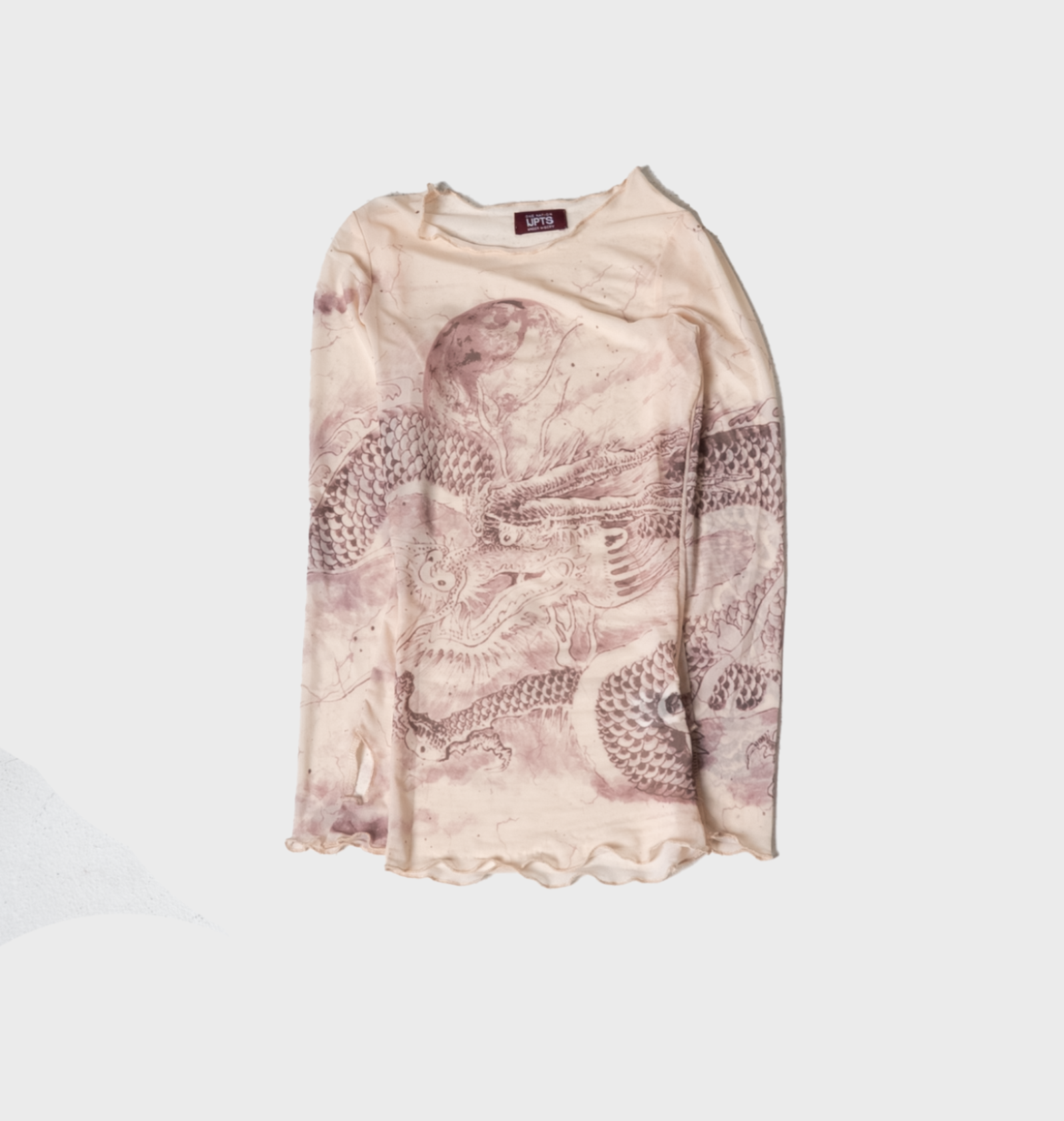A sheer rebellion stitched in smoke and scales. This long-sleeve mesh clings like armor but breathes like sin, with a hand-drawn dragon coiled across the body—wrapping your silhouette in fire and fury. It’s not just a top, it’s a statement: delicate but dangerous, soft but venom-laced. Wear it layered, wear it bare, wear it like you own the night.